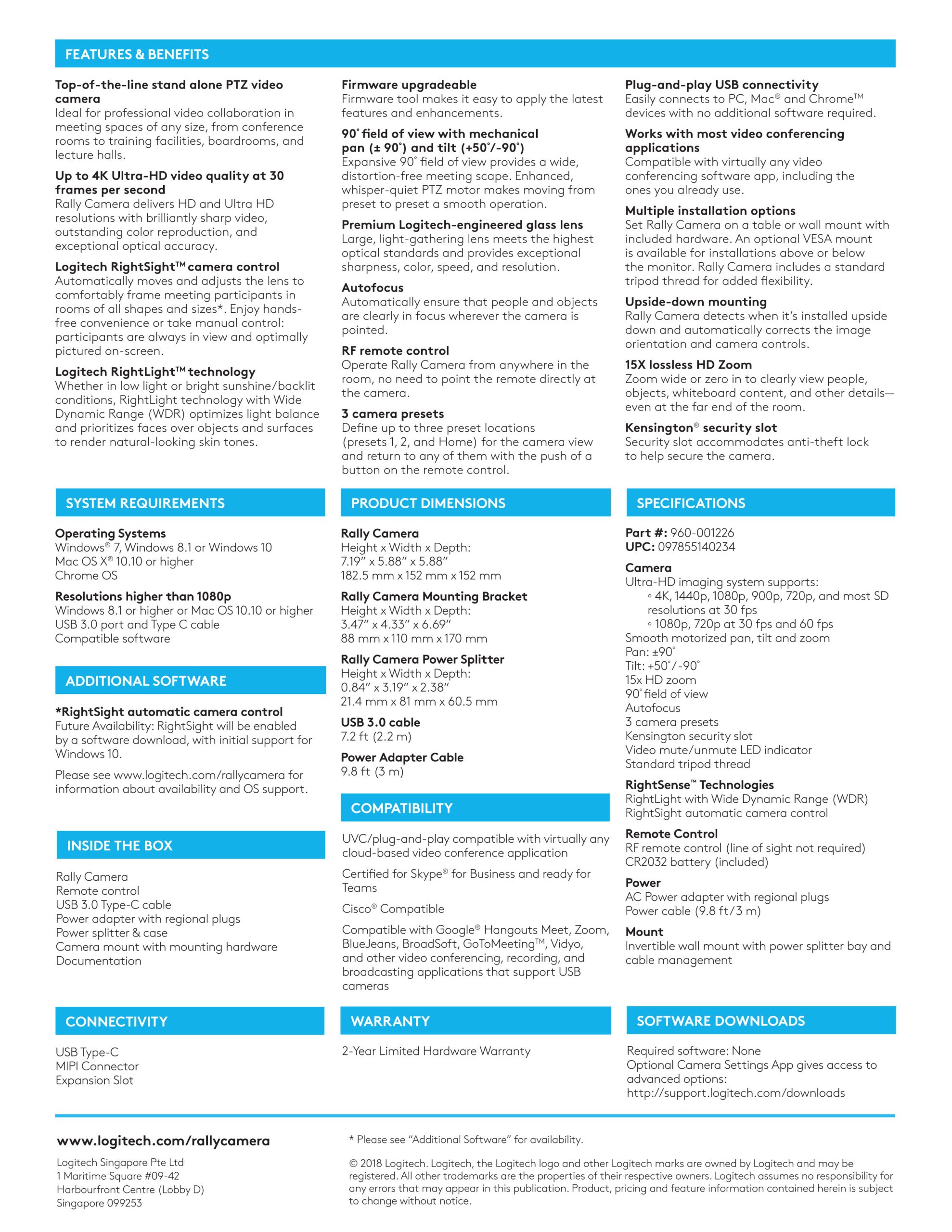 Simply connect to power (regional plugs included) and to PC, Mac and Chrome devices via USB. Rally Camera is UVC/plug-and-play compatible with virtually any video conferencing, recording, and broadcasting application that supports USB cameras.