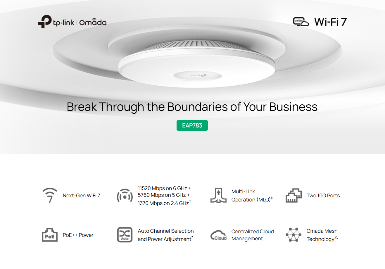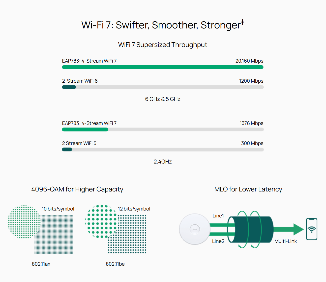‡Use of Wi-Fi 7 (802.11be), Wi-Fi 6 (802.11ax), and features including Multi-Link Operation (MLO), 320 MHz Bandwidth, 6 GHz, 4K-QAM, Multi-RUs, OFDMA, MU-MIMO, and BSS Color require clients to also support the corresponding features.