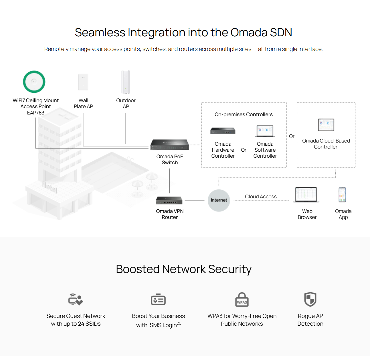 *Zero-Touch Provisioning, Auto Channel Selection and Power Adjustment require the use of the Omada Cloud-Based Controller. Go to https://www.tp-link.com/en/omada-cloud-based-controller/product-list/ to confirm which models are compatible with the Omada Cloud-Based Controller.
