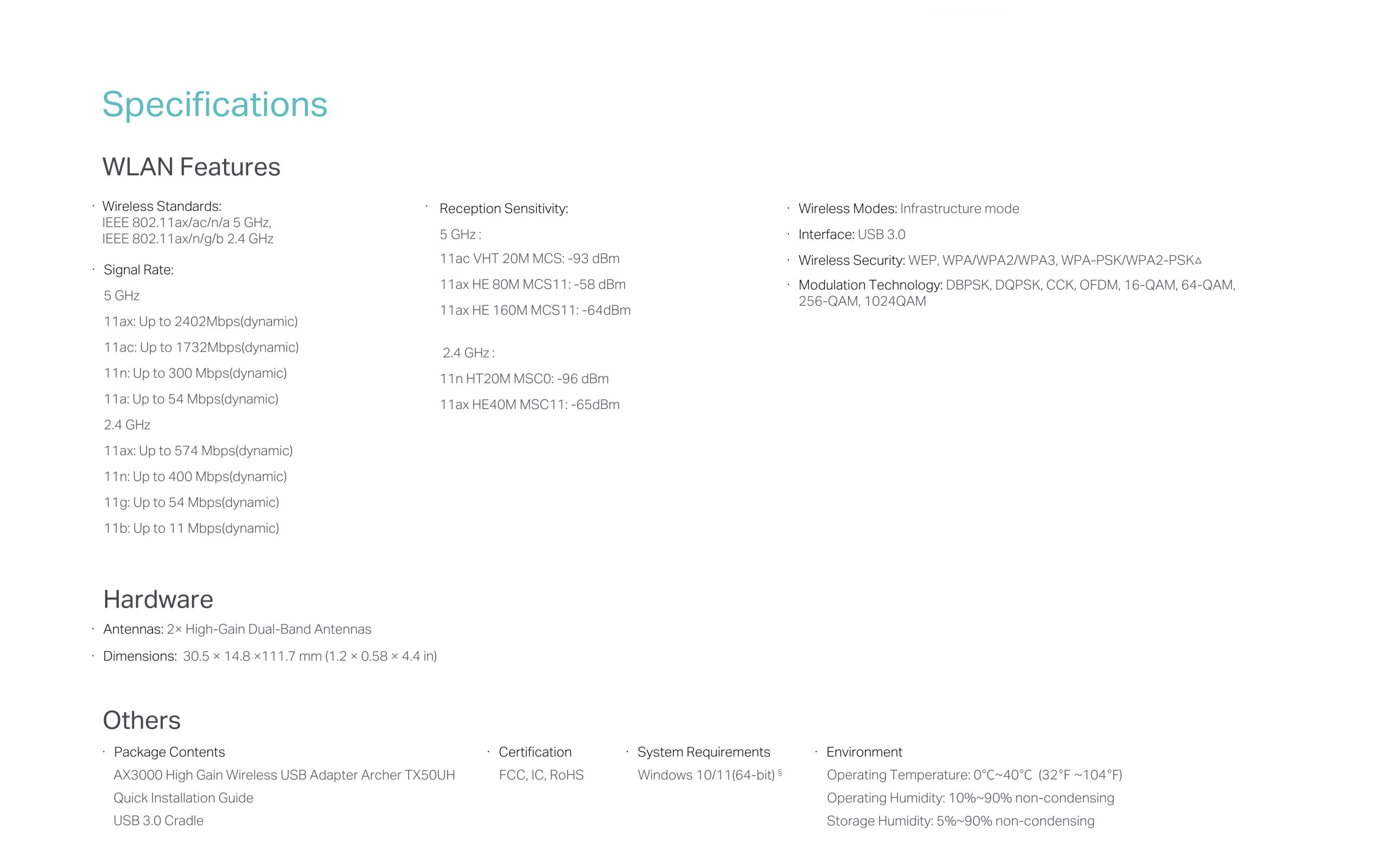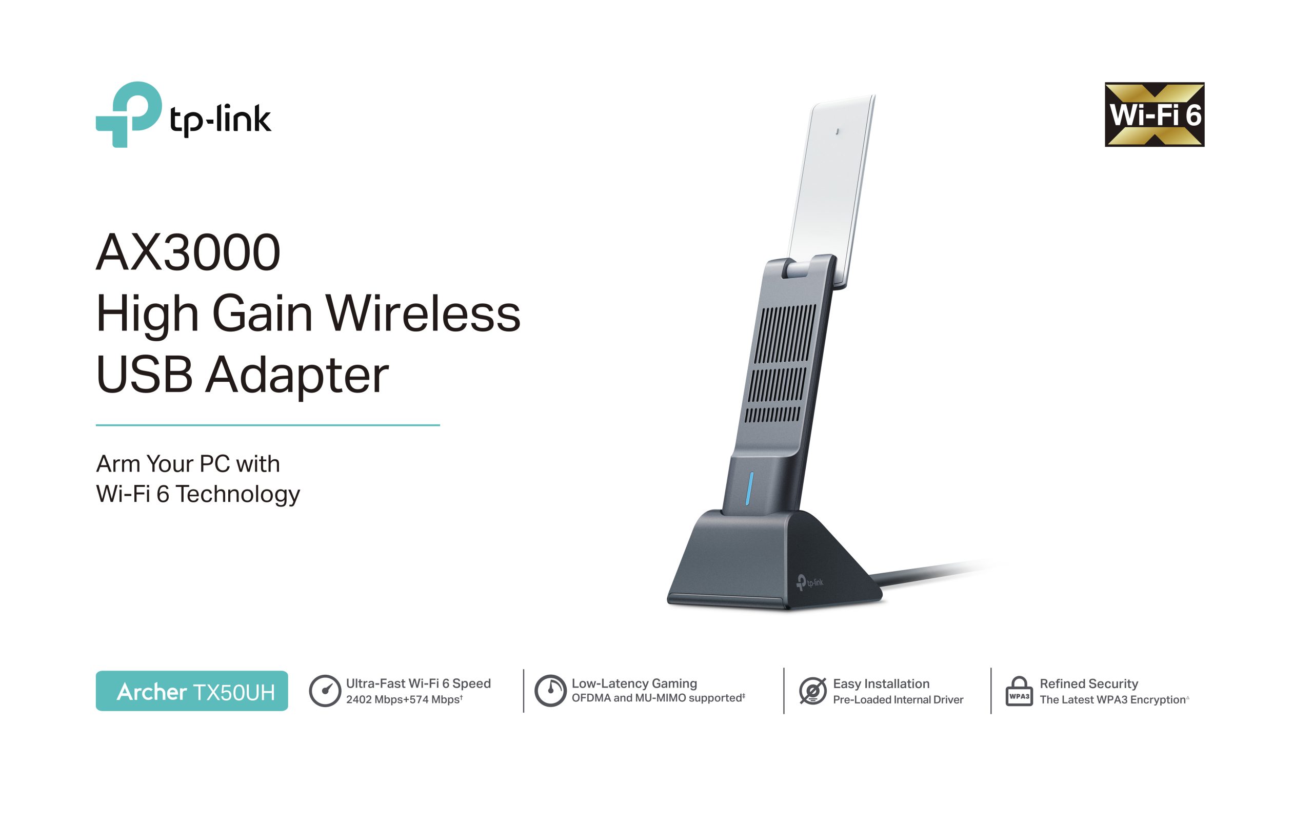 | Package Content | AX3000 High Gain Wireless USB Adapter Archer TX50UH Quick Installation Guide USB 3.0 Cradle |