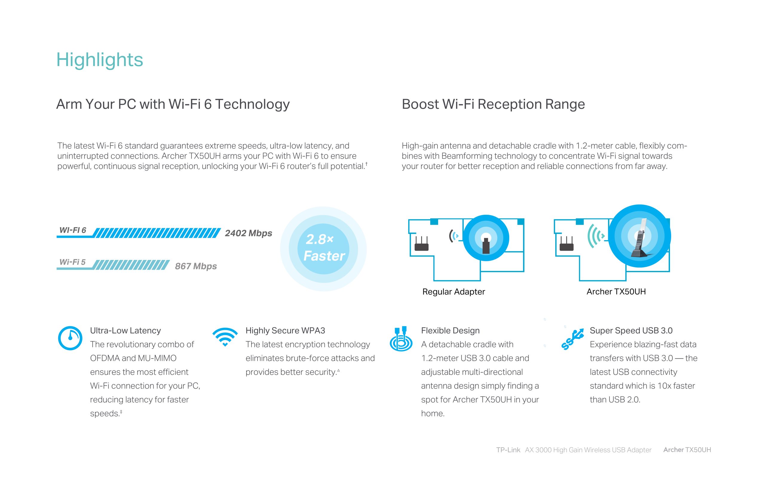 Armed with WiFi 6 technology, Archer TX50UH adapter is designed to deliver a huge boost in coverage, speed, and total capacity. Get on the latest mesh WiFi to enjoy the future network that loads faster and connects more.